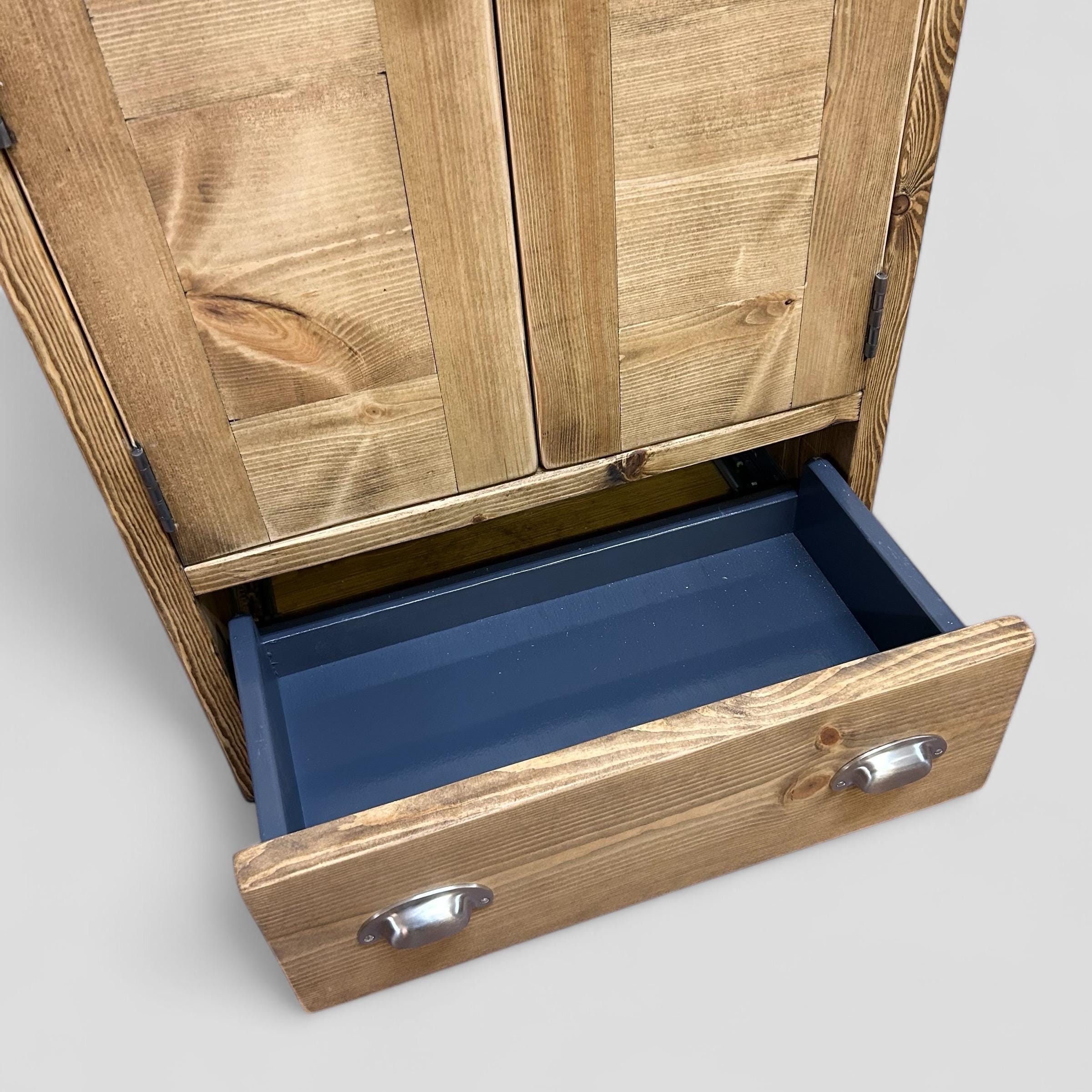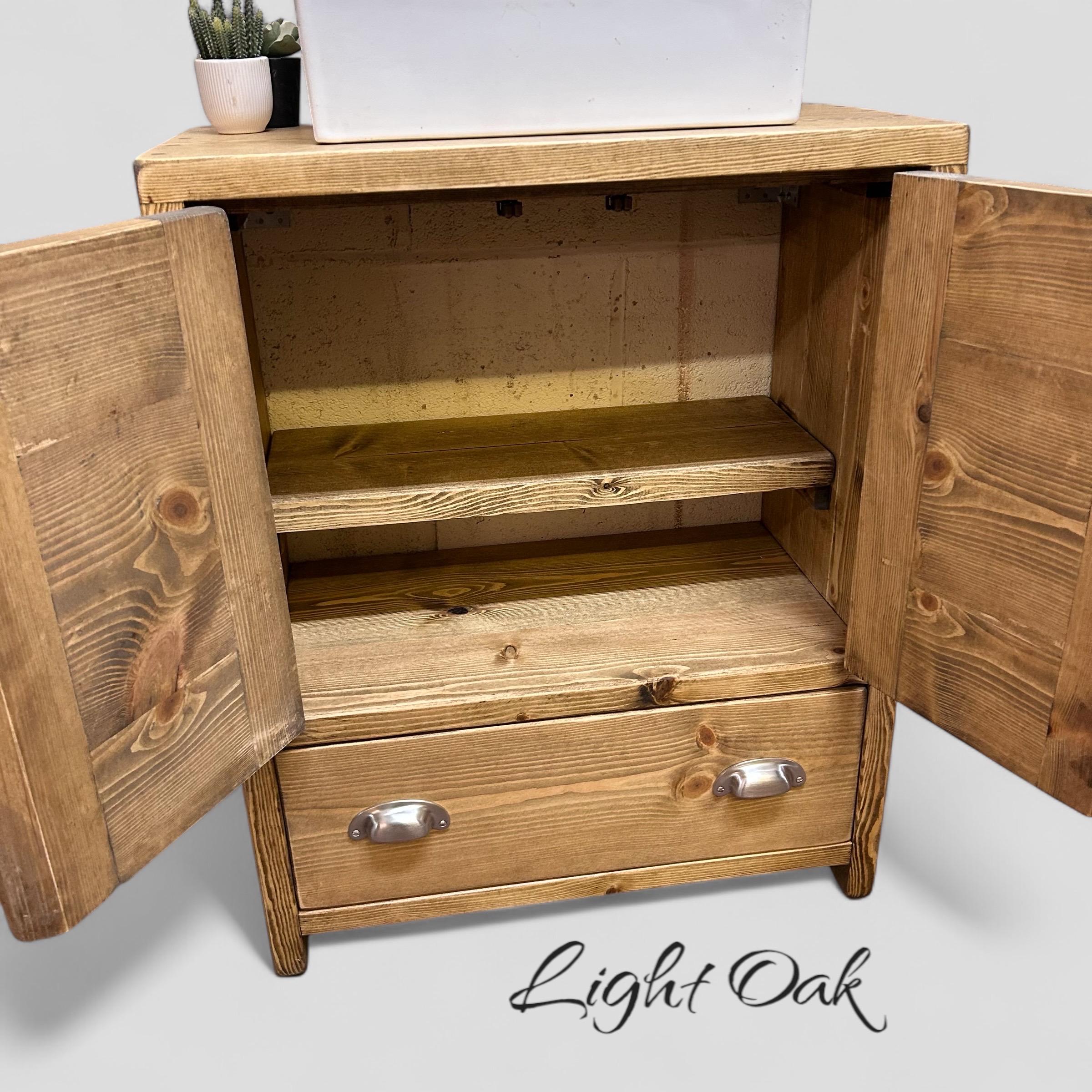 Our bathroom range of furniture is built using 32 mm thick FSC-certified redwood pine timber, once built the timber is coloured in your choice of oil from our range and then sealed with two coats of eco friendly hard wax oil to both enhance and protect the wood, giving a super smooth soft to the touch finish, we also supply a bottle of spray cleaner to maintain the finish with each unit.