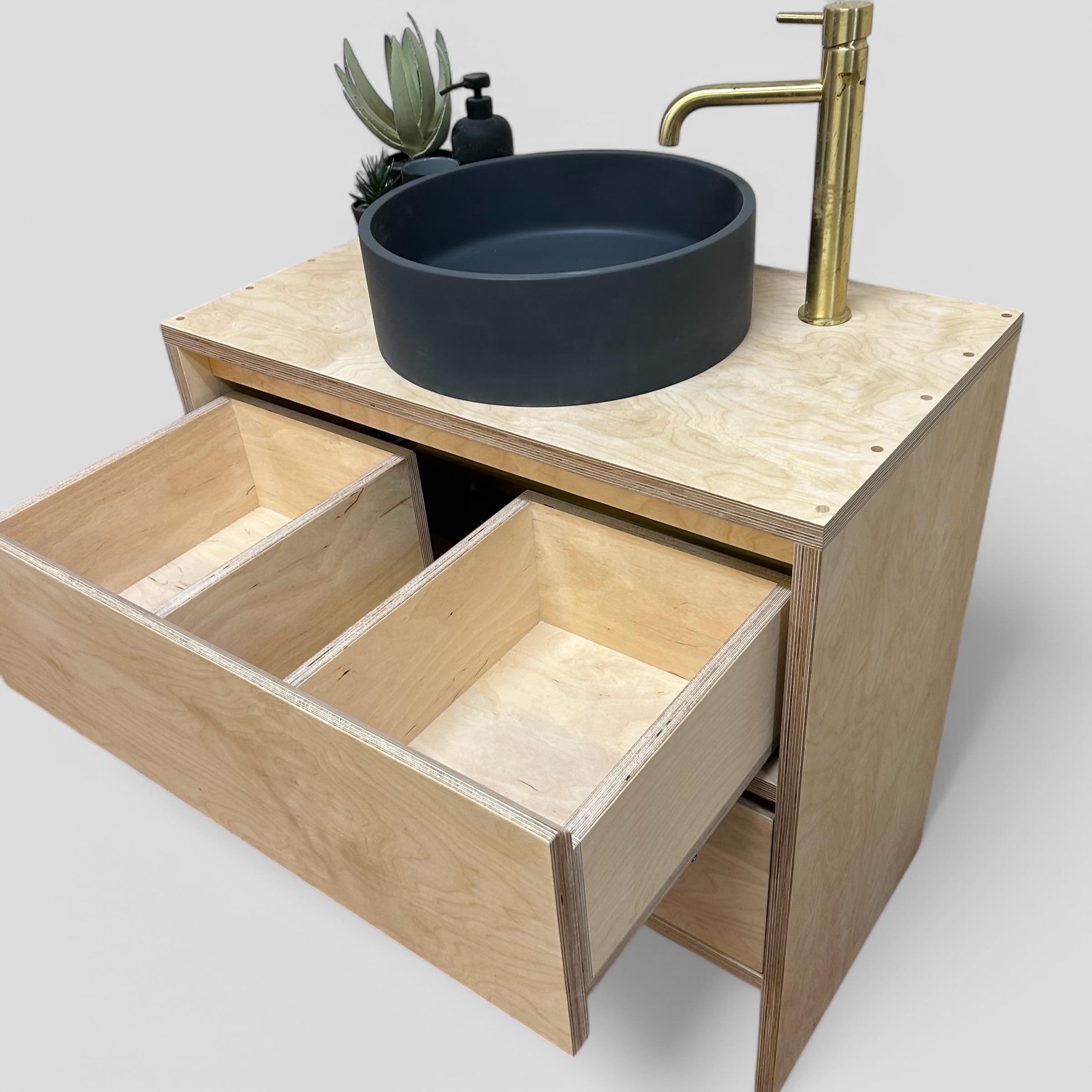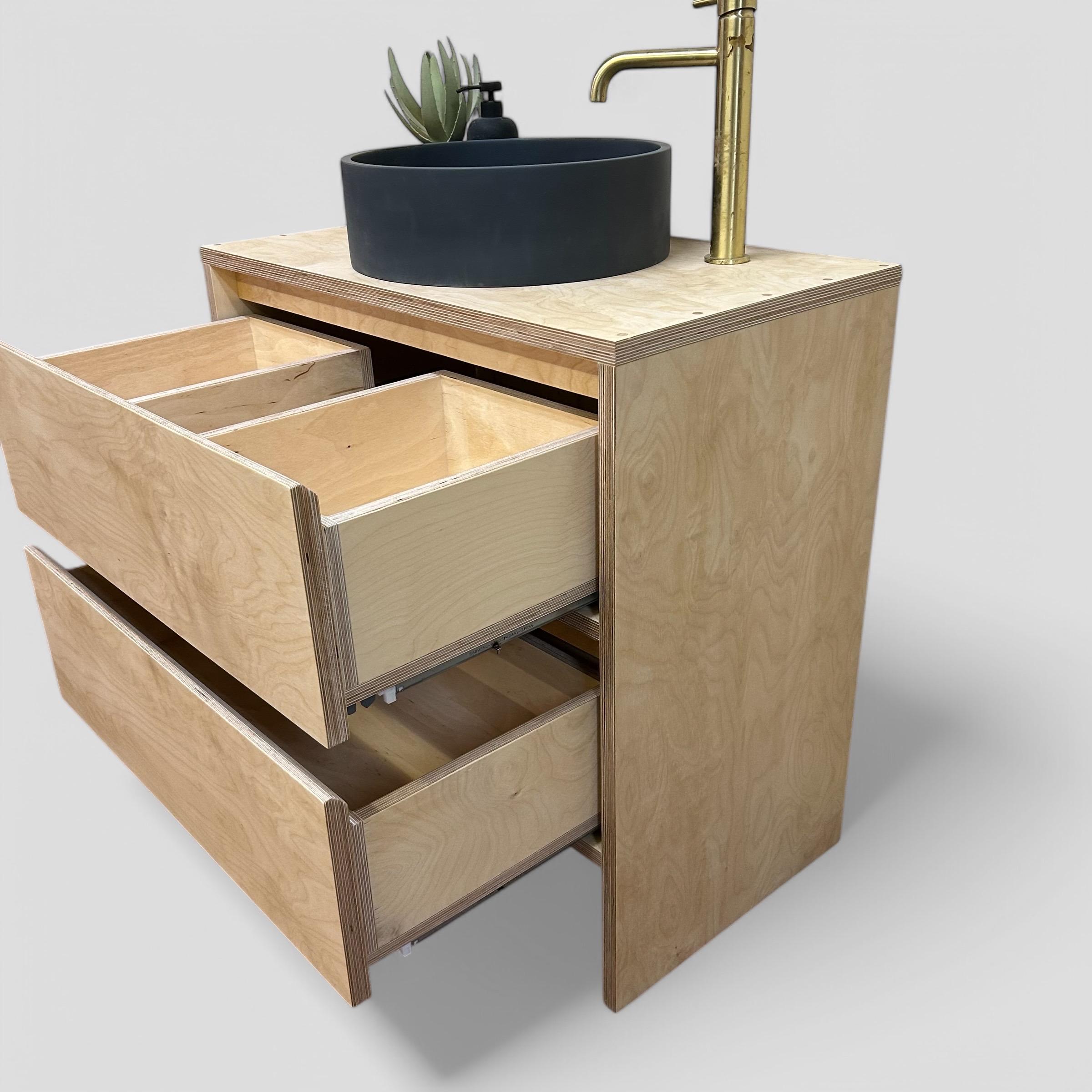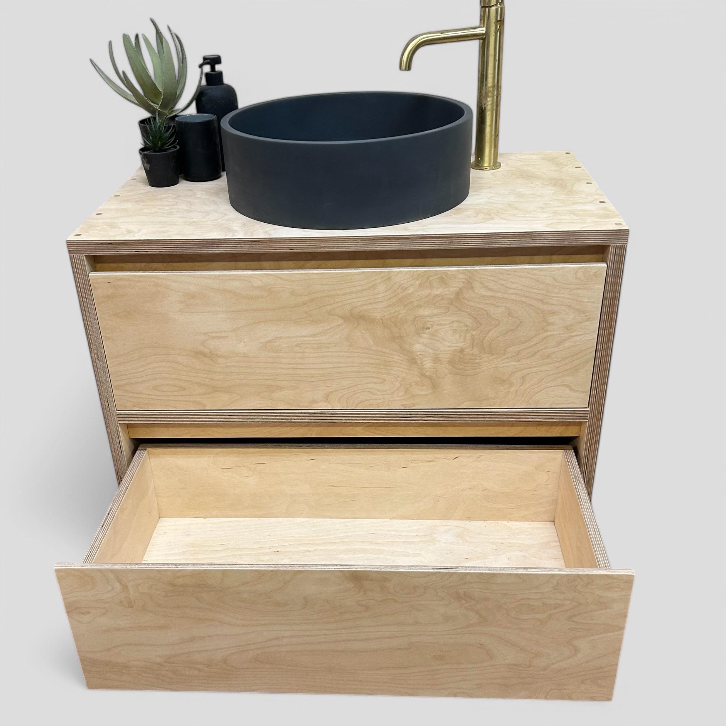 Our beautiful scandi style 24 mm thick birch ply vanity unit, choose either our D shaped cutout or finger lip drawer style, as this version.