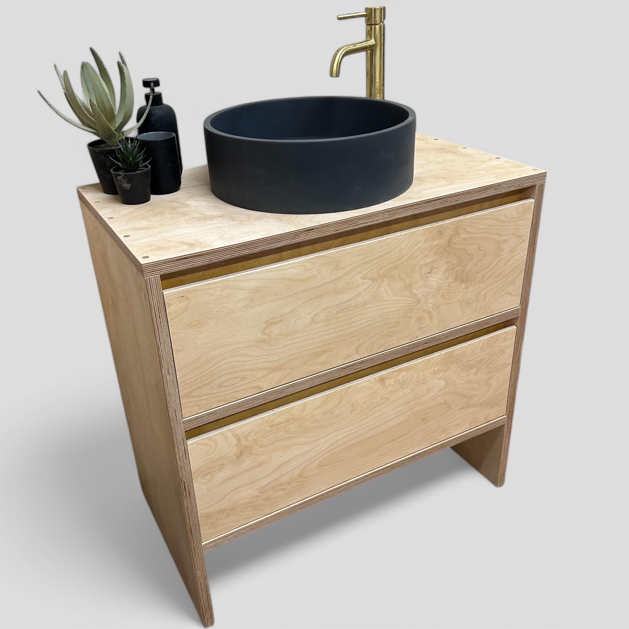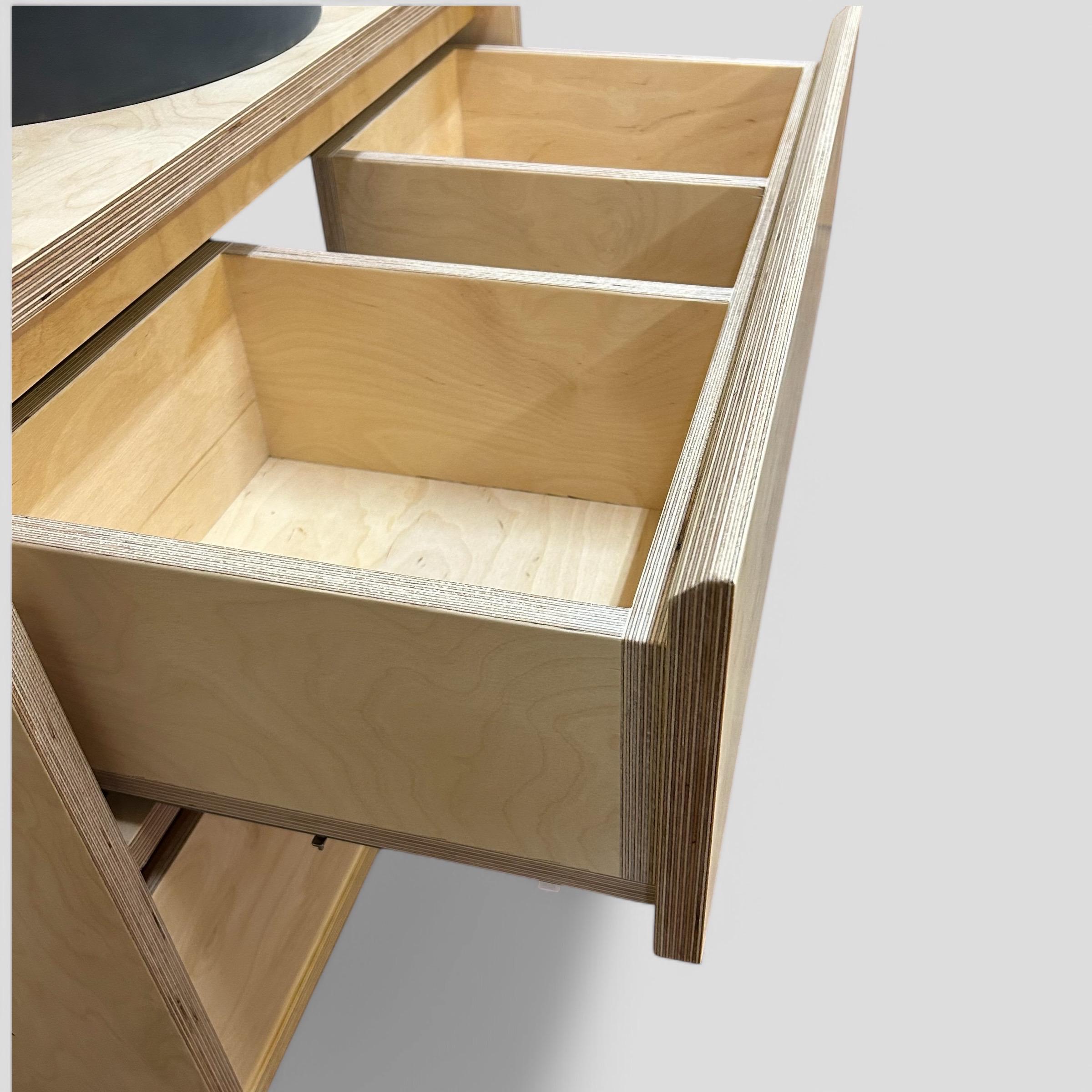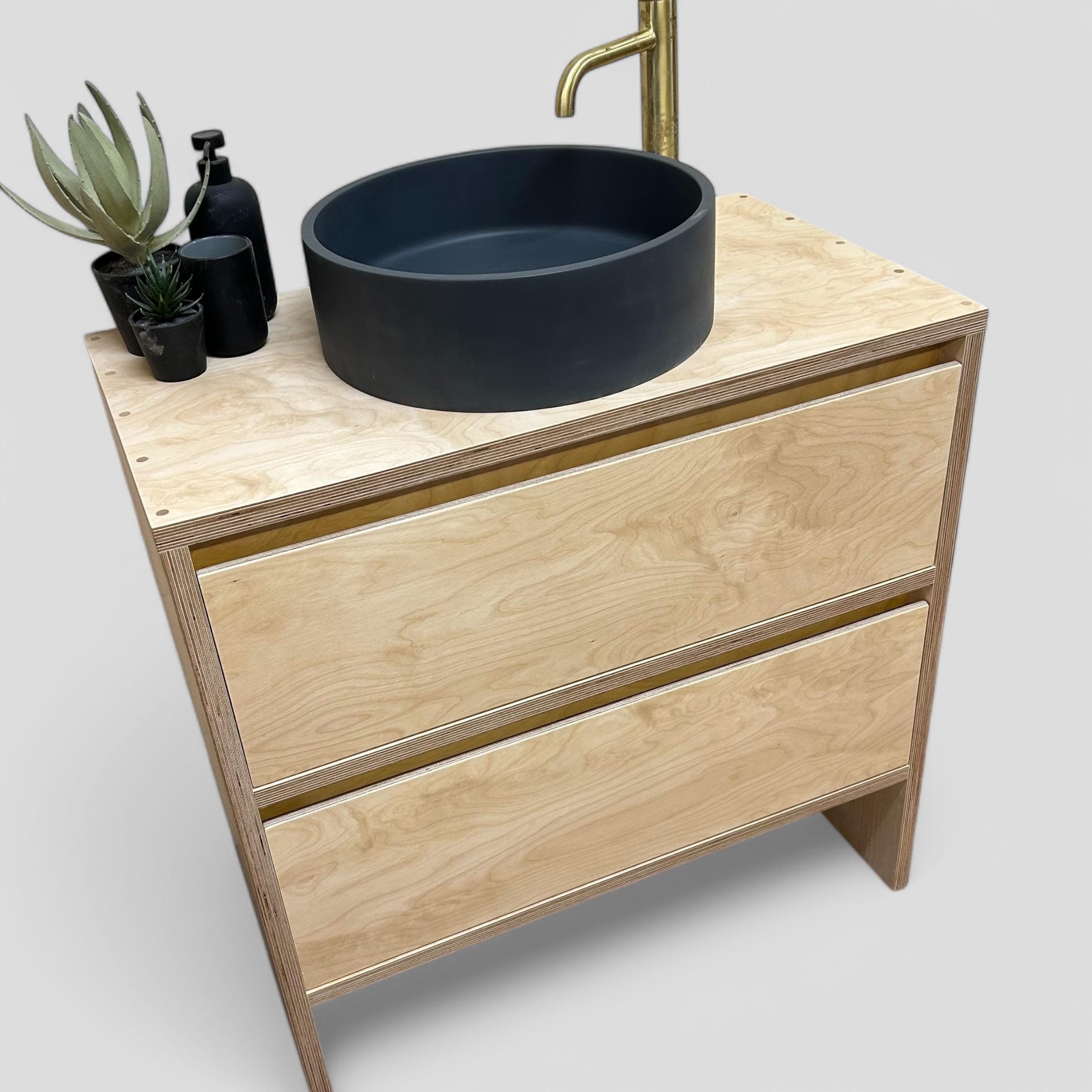 Our beautiful scandi style 24 mm thick birch ply vanity unit, choose either our D shaped cutout or finger lip drawer style, as this version.