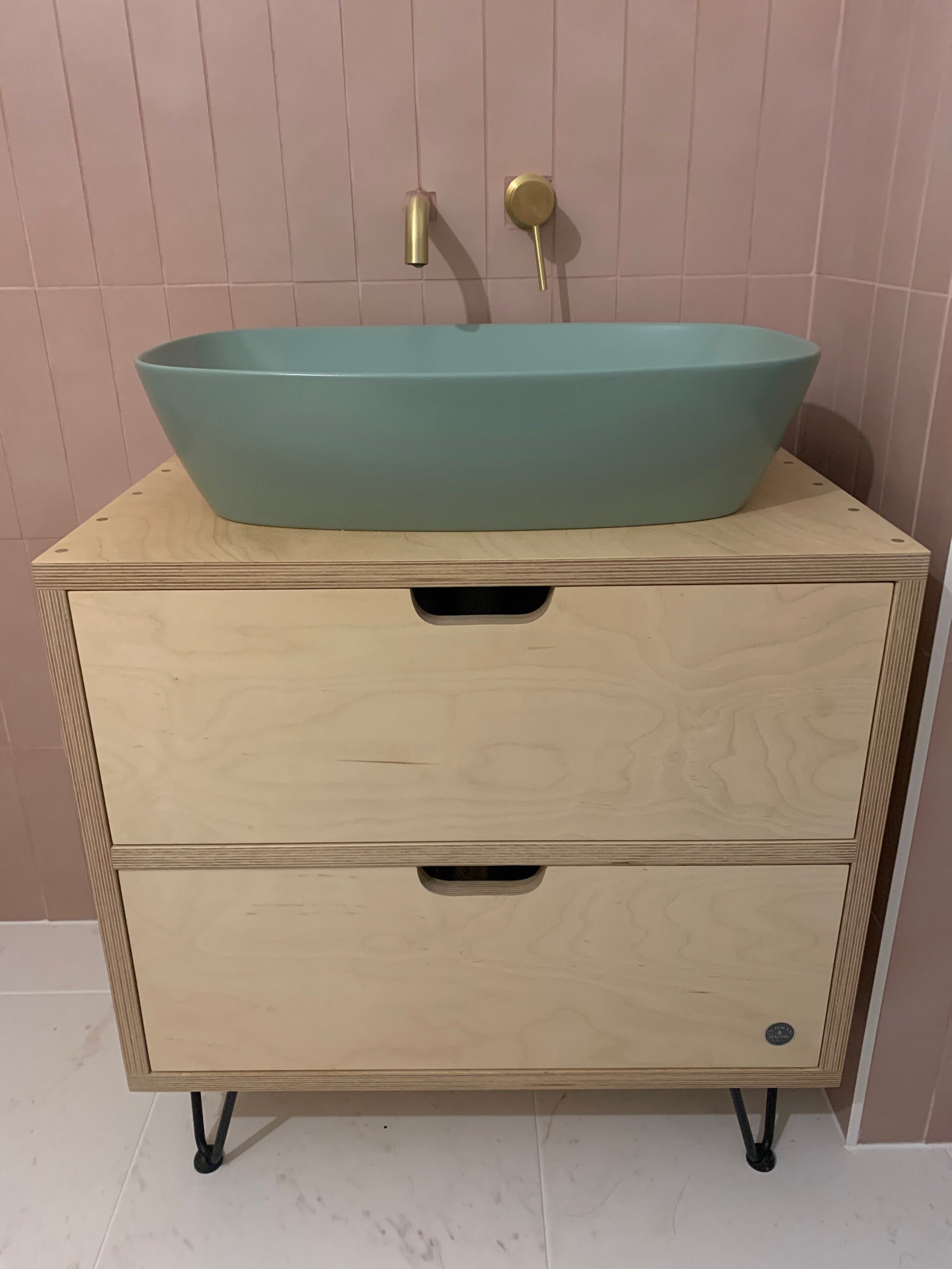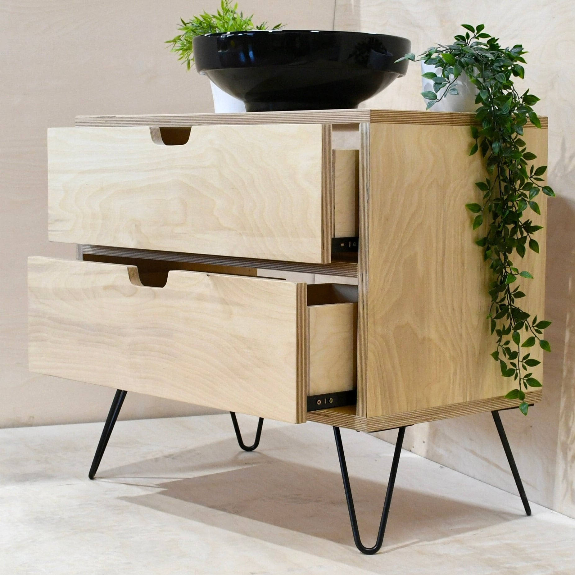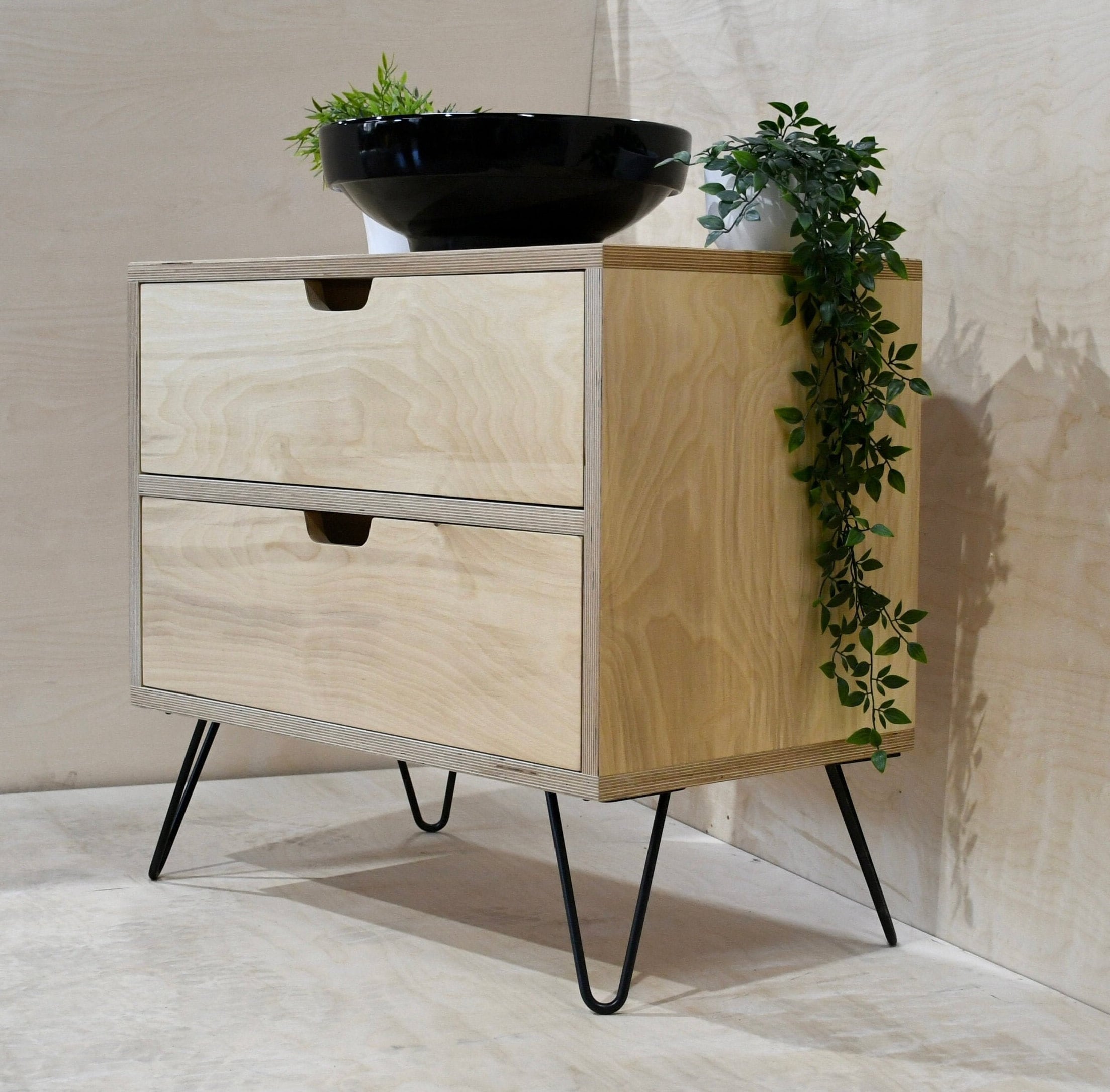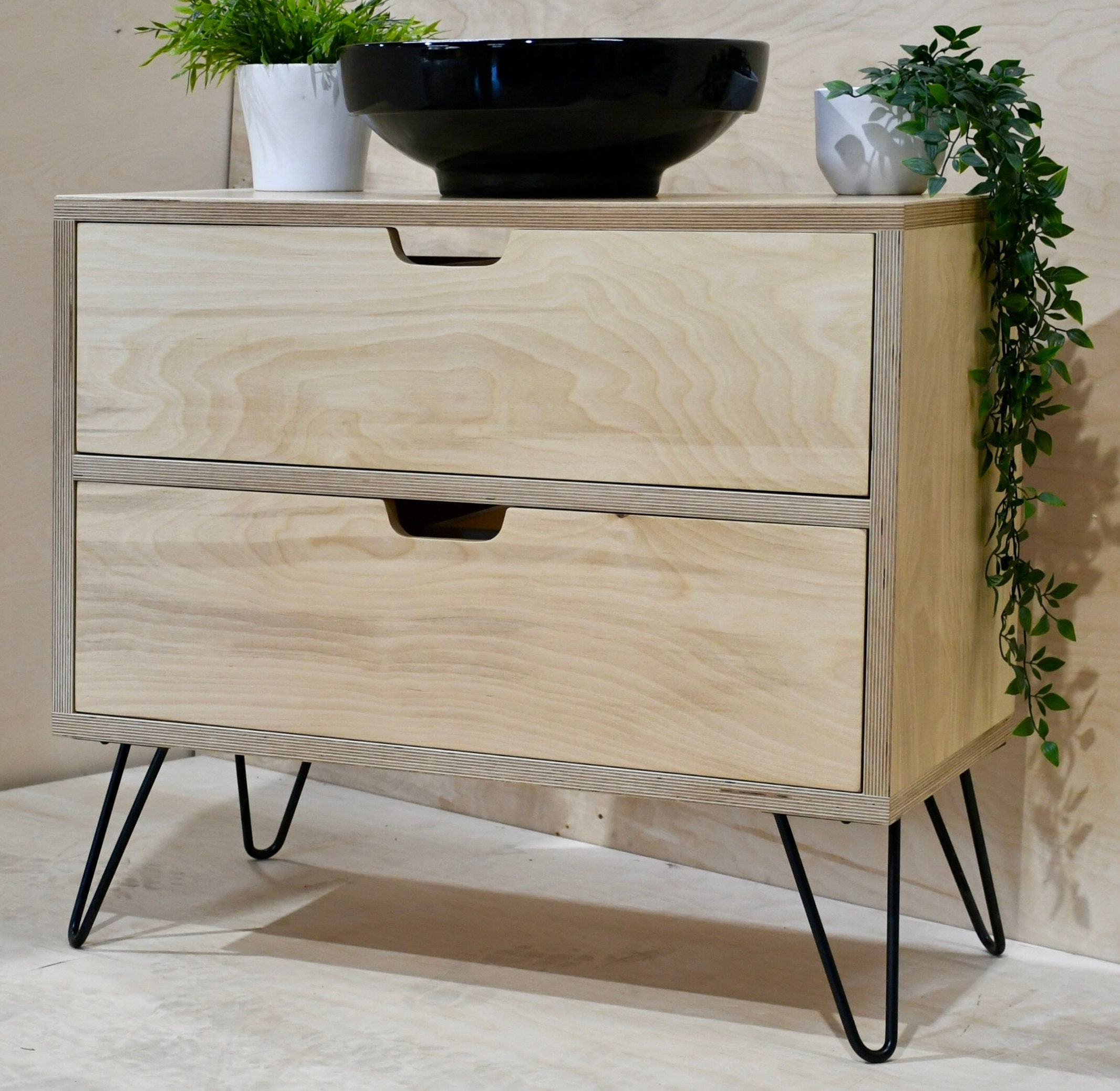 Our beautiful scandi style birch ply drawer vanity unit with 200 mm hairpin legs in a range of colours
