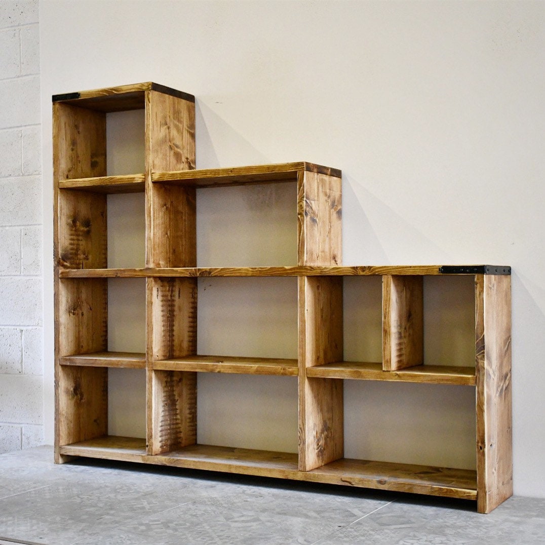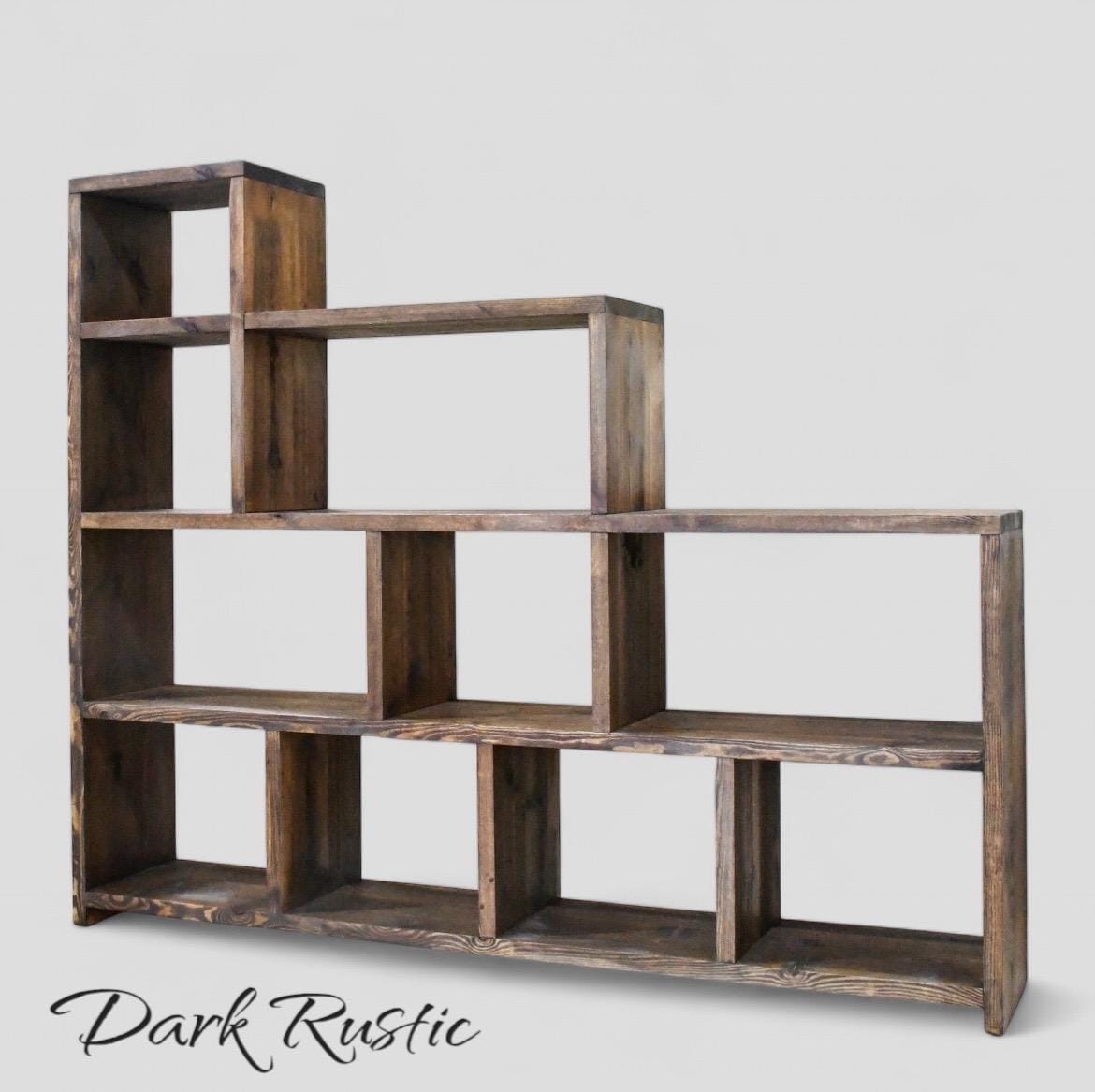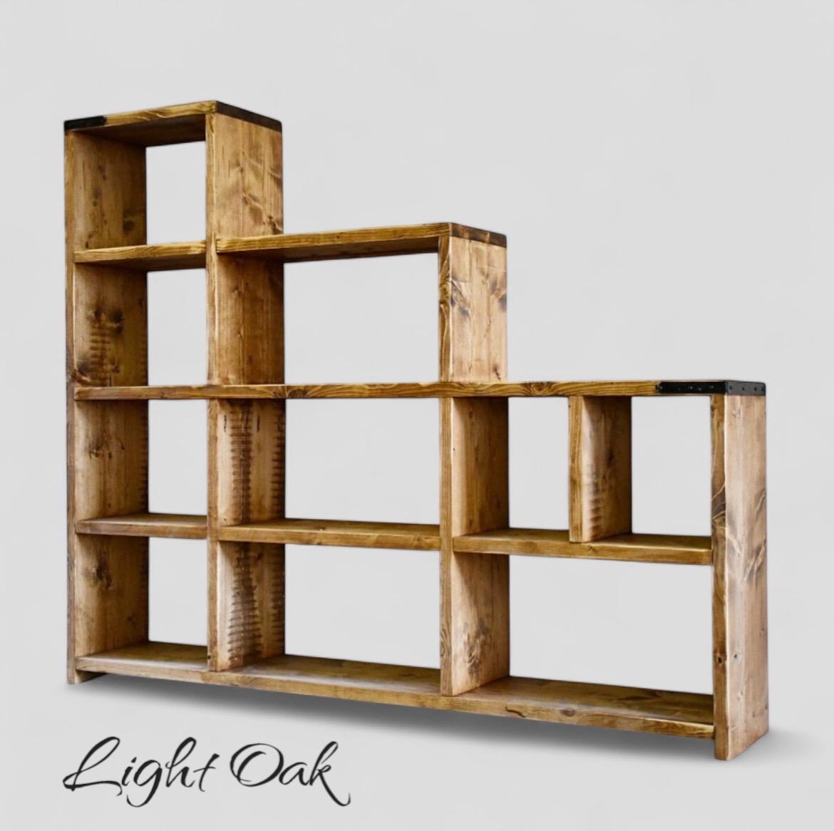 This staggered wood room divider / bookcase and shelving unit is perfect for housing your books, records and ornaments. It is made with 100% kiln dried and sustainably sourced 32mm timber and is finished with two coats of high grade & eco friendly wax oil.